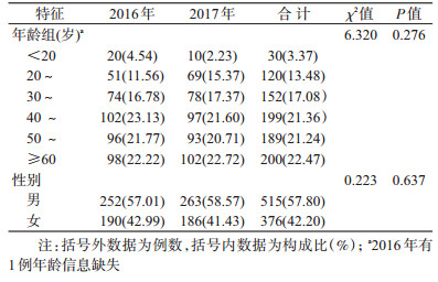 (2)单位体检者:2016年19个哨点共监测37 562人,年龄(37.15±12.33)岁,20~49岁占75.87%;男性18 269人(48.64%),女性19 293人(51.36%)。2017年20个哨点共监测39 588人,年龄(37.14±12.57)岁,主要集中在20~49岁,占75.58%;男性18 257人(46.12%),女性21 331人(53.88%)。