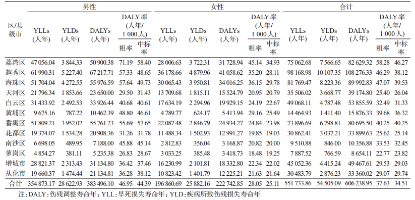2.恶性肿瘤DALY情况:2010-2011年广州市居民恶性肿瘤疾病负担共损失606 238.95人年, 每千人口损失DALYs为37.63人年, 中标DALY率为34.51人年/1 000人。2012-2013年广州市恶性肿瘤共损失623 763.80人年, 每千人口DALY为37.81人年, 中标DALY率为34.00人年/1 000人。2010-2011年和2012-2013年广州市DALY损失最大的前5个行政区均依次是越秀区、海珠区、荔湾区、番禺区和白云区, 其合计损失分别占全市DALY比例的69%和64%。