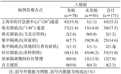 4.病例发现方式:病例入境后确诊时长平均为2.9 d。入境前发病占45.6%(78/171),入境前未发病占54.4%(93/171),“120”通道发现占25.2%(43/171),海关留验发现占18.7%(32/171),集中隔离点发现占15.8%(27/171),社区留验点发现占31.0%(53/171),居家隔离期间社区管理发现占7.0%(12/171),自主就医发现占2.3%(4/171)。见表 3。