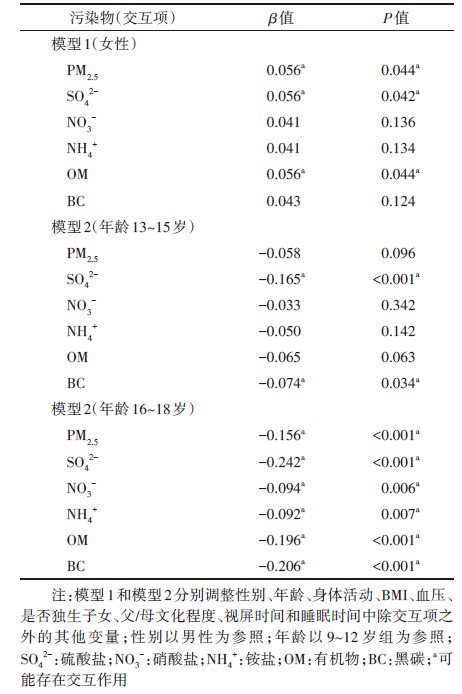 以PM2.5及其组分低污染组为参照,调整混杂因素的回归模型显示,在体力活动不足的儿童青少年中,高污染物暴露是高心理困扰的危险因素(P < 0.001)。PM2.5及其组分污染和体力活动充足组心理困扰无统计学关联(P > 0.05);PM2.5、SO42-、NO3-高污染为男生、女生心理困扰的危险因素,NH4+、OM和BC在女生组中表现为危险因素(均P < 0.05);和正常/消瘦学生相比,在超重/肥胖群体中,高浓度的PM2.5、NH4+、OM、BC和高心理困扰关联更强;与13~15岁、16~18岁学生相比,9~12岁学生中,高浓度污染物和高心理困扰关联更强。见表 3。