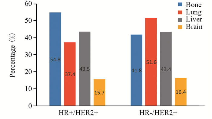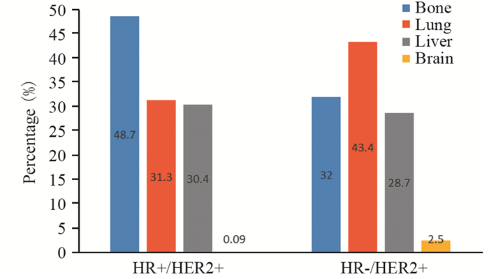 | 图 1 不同HR状态HER2阳性晚期乳腺癌首发远处转移部位比例 Figure 1 Percentage of first distant metastasis sites in advanced HER2-positive breast cancer patients with different HR status |