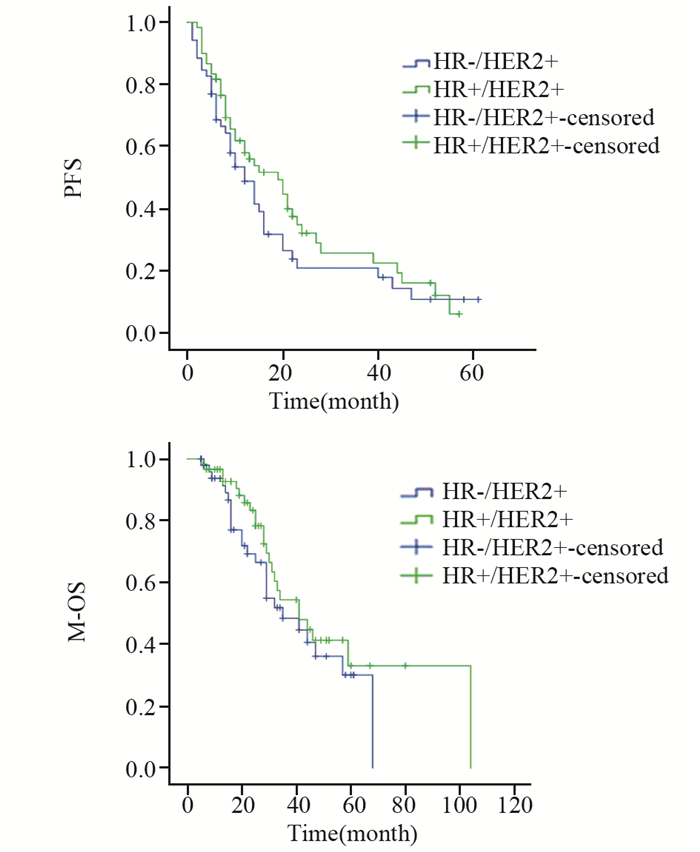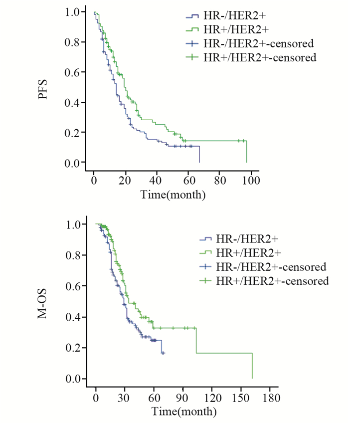 | 图 5 HR+/HER2+与HR-/HER2+组HER2+晚期乳腺癌PFS及M-OS比较 Figure 5 Comparison of PFS and M-OS between HR+/HER2+ group and HR-/HER2+ group |