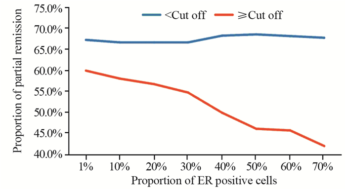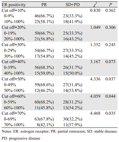 本研究中ER阳性定义为ER阳性细胞数所占比例≥1%,而将ER阳性细胞数所占比例采取不同截断值(截断值< 10%组与≥10%组;< 20%与≥20%组等),对这部分患者的疗效进行进一步比较结果显示,随着选取的截断值增加,ER阳性细胞数所占比例≥截断值的患者达到PR的比例逐渐降低,见图 4,当截断值取≥50%时,两组间差异有统计学意义(均P < 0.05),见表 4。