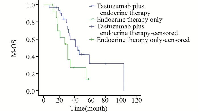 | 图 6 接受解救曲妥珠单抗联合内分泌治疗与单内分泌治疗的HR+/HER2+乳腺癌患者M-OS比较 Figure 6 Comparison of M-OS between palliative trastuzumab therapy plus endocrine therapy group and endocrine therapy alone group of advanced HR+/HER2+ breast cancer patients |