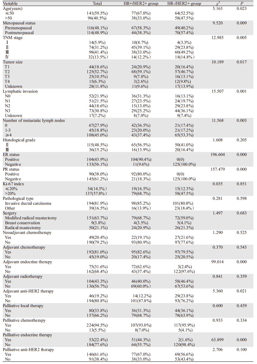 2.2 HR+/HER2+与HR-/HER2+患者临床病理特征比较全组患者中,HR+/HER2+占48.5%(115例),其中ER+/PR+的患者占69.6%(80例)、ER+/PR-患者占20.9%(24例)、ER-/PR+患者占9.6%(11例);HR-/HER2+占51.5%(122例)。HR+/HER2+组中,58.3%的患者确诊乳腺癌时为绝经前状态,47.8%的患者临床分期为Ⅰ~Ⅱ期,T分期为T1~2者占80.0%,未发生腋窝淋巴结转移者占31.3%。HR-/HER2+组中,40.2%的患者确诊乳腺癌时为绝经前状态,27.1%的患者临床分期为Ⅰ~Ⅱ期,T分期为T1~2者占63.1%,未发生腋窝淋巴结转移者占13.1%。两组间上述差异均具有统计学意义(P < 0.05),在病理类型、组织学分级、Ki67指数上两组间差异无统计学意义,见表 1。
