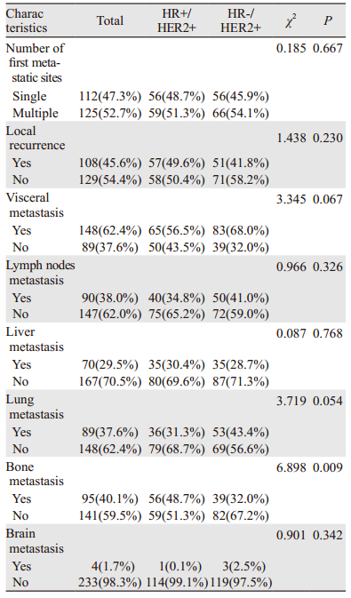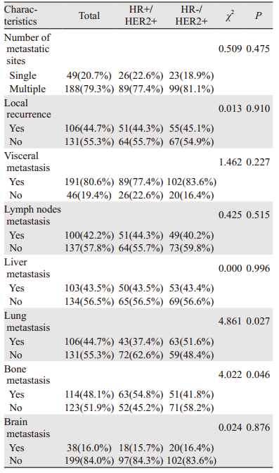 ER和(或)PR阳性者为HR阳性,HER2阳性乳腺癌患者中有50%同时也为HR阳性[5]。与HER2基因过表达者预后相对较差不同,HR阳性(HR+)同时HER2阳性(HER2+)者预后相对较好。基因表达谱研究表明HR+/HER2+与HR-/HER2+是两种不同亚型[1],HR-/HER2+多高表达表皮生长因子受体(epidermal growth factor receptor, EGFR)、HER2和成纤维细胞生长因子型受体(fibroblast growth factor 4receptor, FGFR4)等酪氨酸激酶受体,而HR+/HER2+多表达GATA3、B细胞淋巴瘤/白血病-2(B cell lymphoma/leukemia2, Bcl2)以及雌激素受体α1基因(estrogen receptorα1 gene, ESR1)等Luminal亚群基因。国外有研究表明,与HR-/HER2+相比,HR+/HER2+组织学分级较低,多发生骨转移,较少发生脑转移,预后较好[6]。新辅助临床试验结果显示,不同HR状态的HER2阳性乳腺癌患者新辅助抗HER2靶向治疗疗效不同,HR阴性患者有更高的病理缓解率(pathologic complete response, pCR)[7-8];而不同HR状态在解救抗HER2靶向治疗疗效上是否存在差异目前还不明确,目前国内关于不同HR状态的HER2阳性乳腺癌生物学特性差异研究较少。本研究通过对237例HER2阳性晚期乳腺癌的临床病理学特征及预后进行回顾性分析,旨在探讨不同HR状态下的HER2阳性晚期乳腺癌患者复发转移特征及预后的关系。